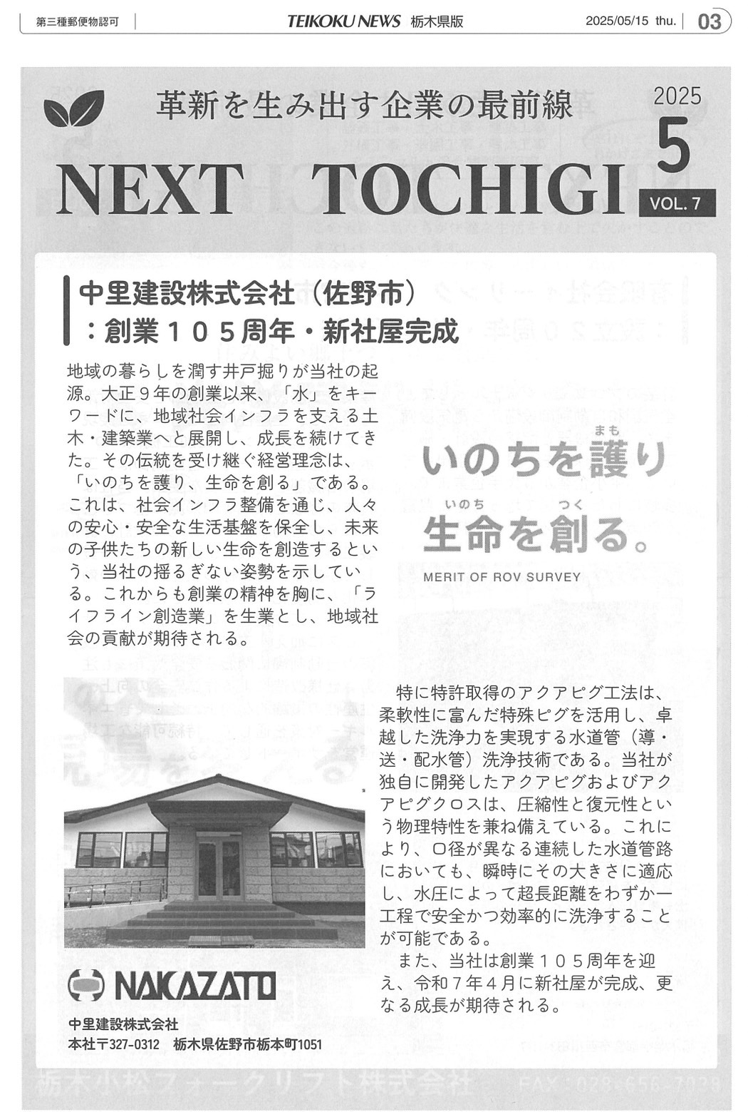 2025年5月15日発行 「週刊帝国ニュース 栃木県版」で当社が特集されました。
